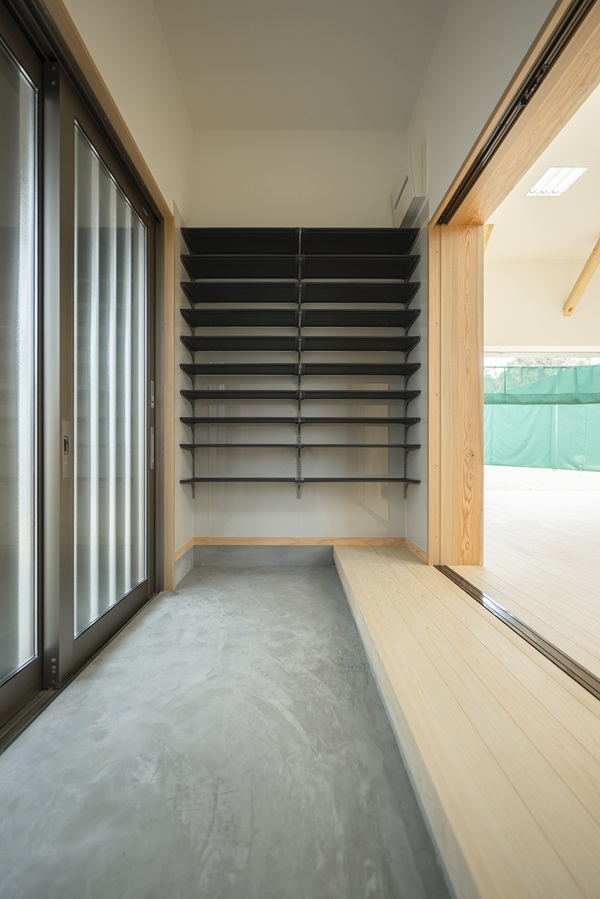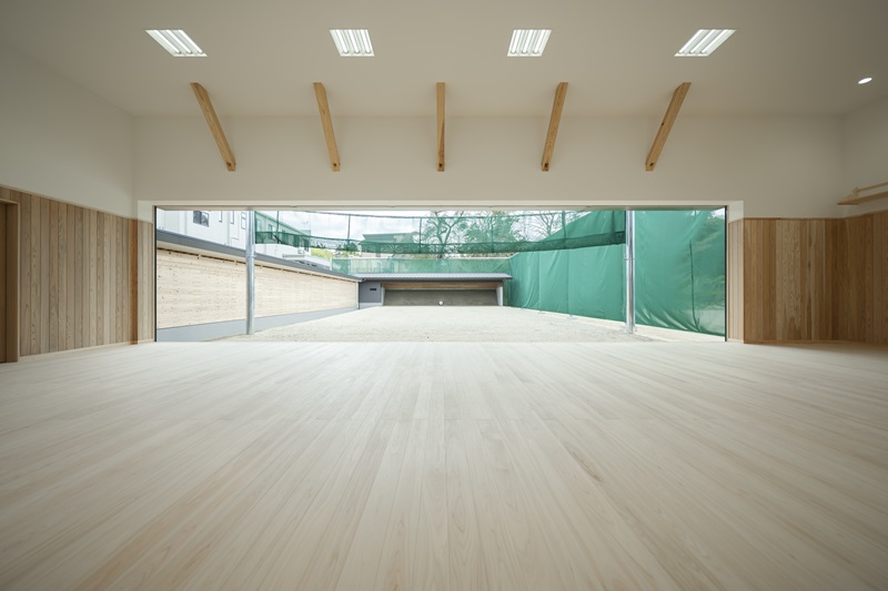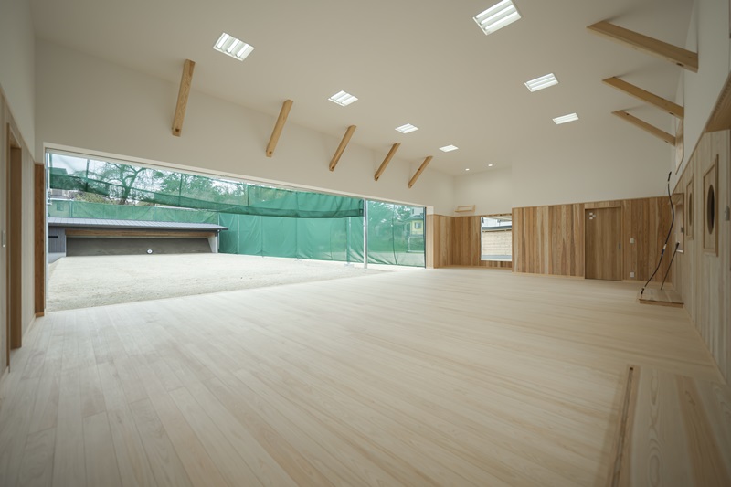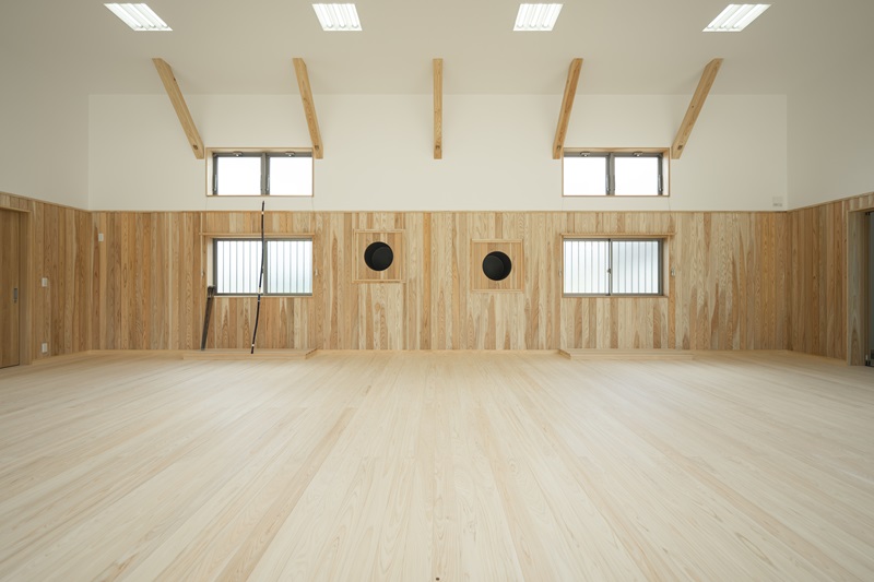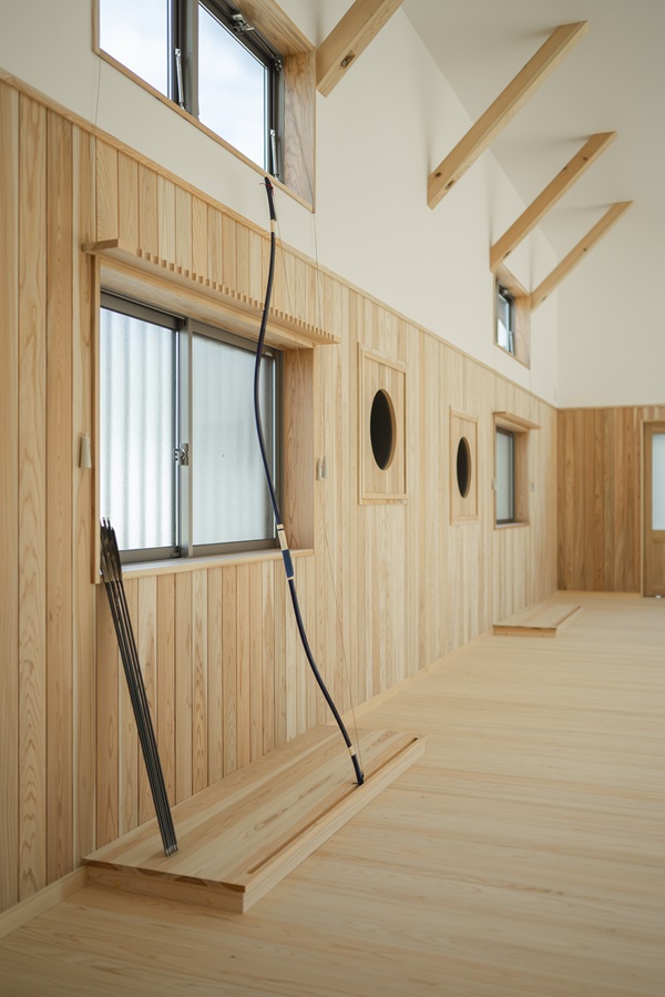 射場の玄関から一歩入ると、幅11m×奥行7m×高さ4mの柱のない大空間と、的場に向けての約11mの大開口に圧倒されますが、床と壁の無垢材の質感が落ち着いた雰囲気を醸し出し、とても心地よい空間となっています。