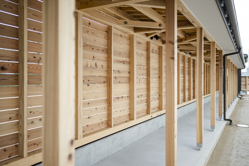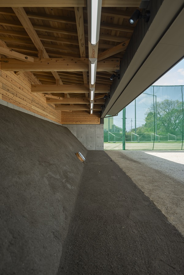 射場の内部の床は足触りのよいなめらかな木肌の無垢のヒノキ材、壁は高さ2mまで無垢のスギ材とし、的に向けての開口には近的競技5人立ちであることから、日常的に使いやすいよう5分割したシャッターを、シャッター上方には長さ2mの庇を設けています。