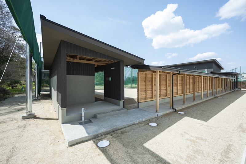 外観は建屋3棟とも切妻屋根、外壁は木材あらわし、もしくはダークブラウン色を基調とし、武道としての弓道場にふさわしい静謐な佇まいとなっています。