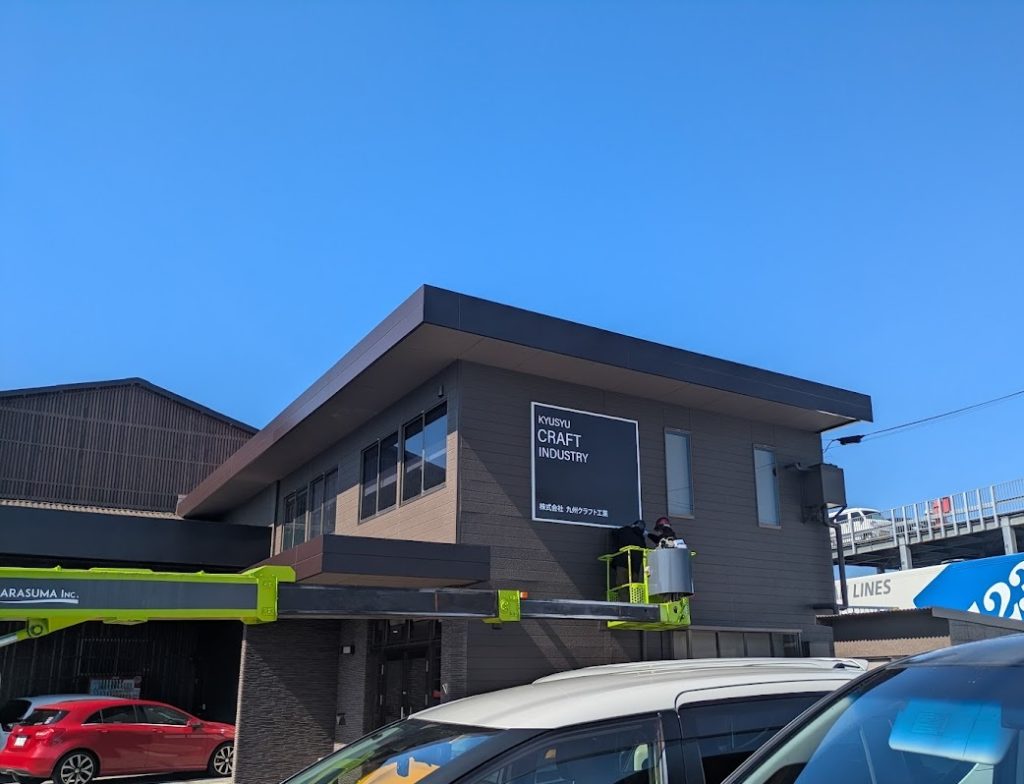 看板の取付作業です。工場の大規模リノベーションです。ダークブラウン×黒に和のテイストも取り入れて新しいスタイリッシュモダンな雰囲気に。看板もそれに合わせてデザインされています。